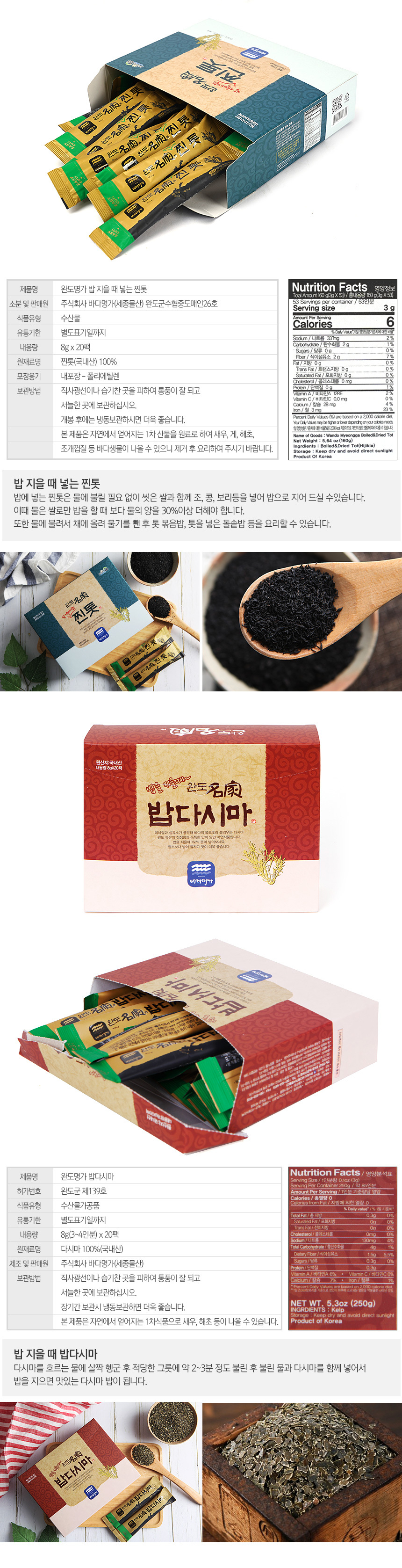 - 원재료명 및 함량: 다시마(다시마-국내산), 톳(톳-국내산)