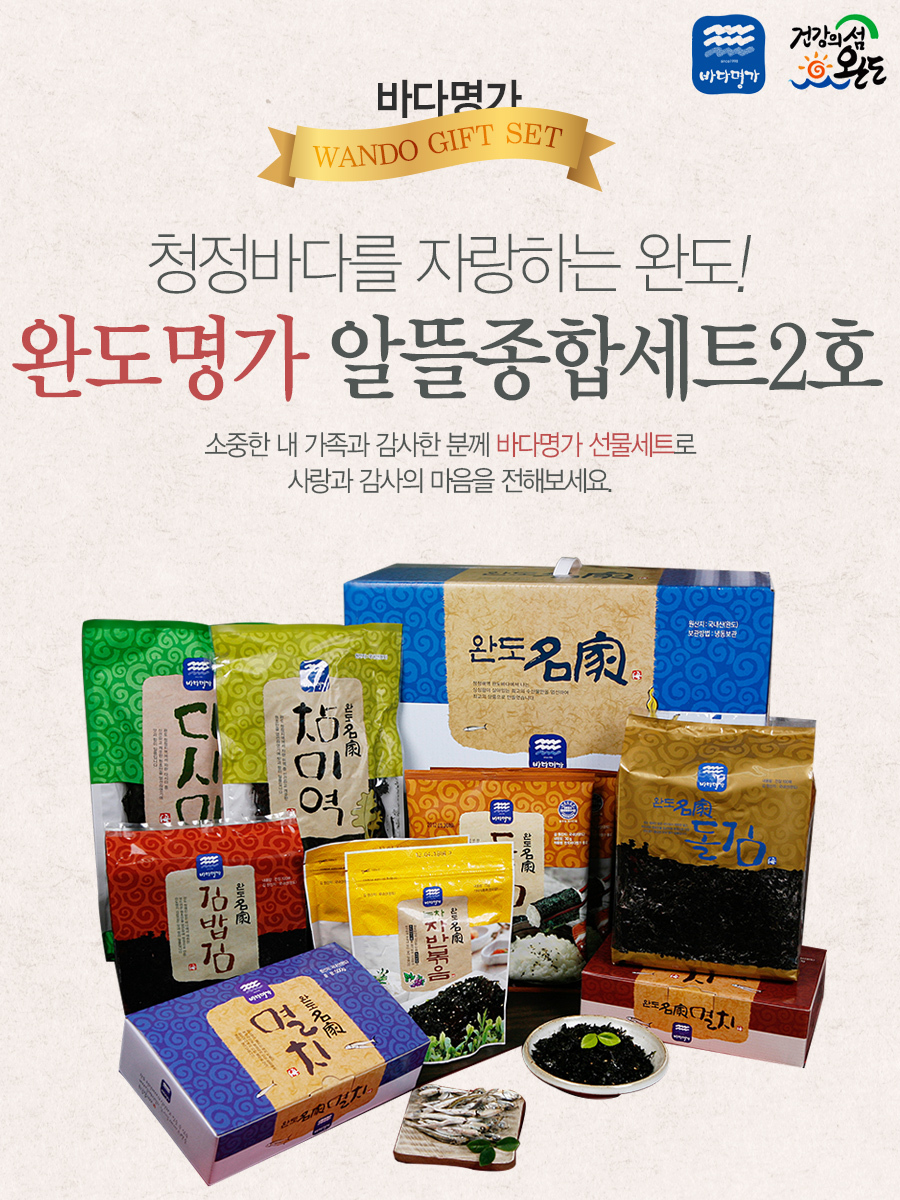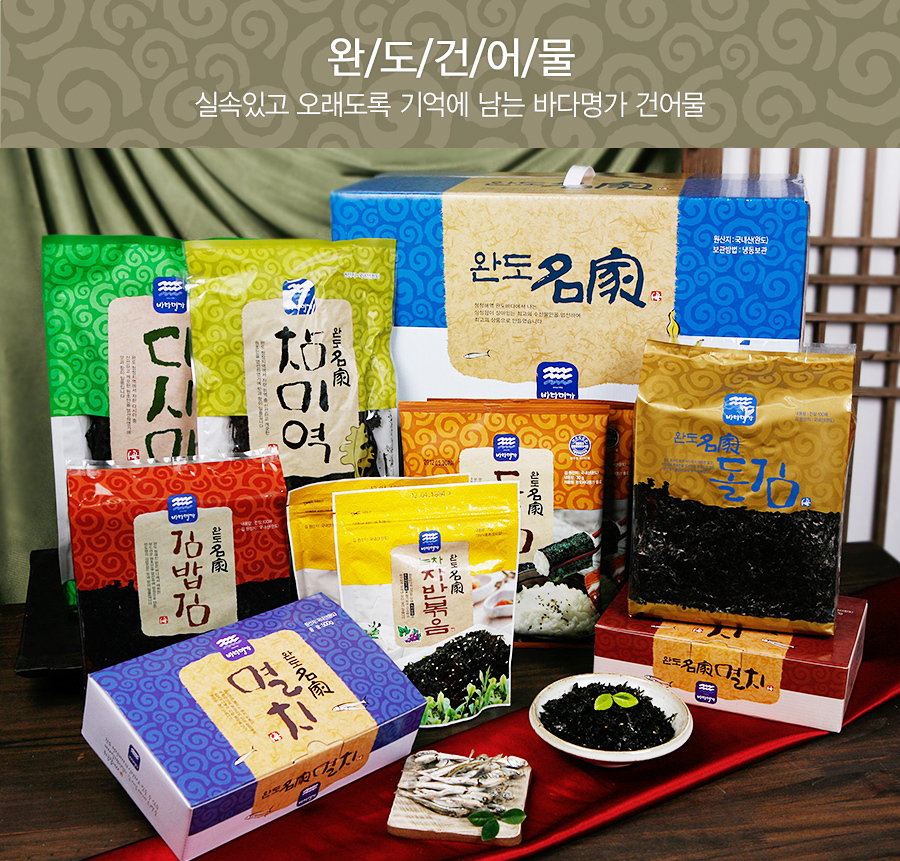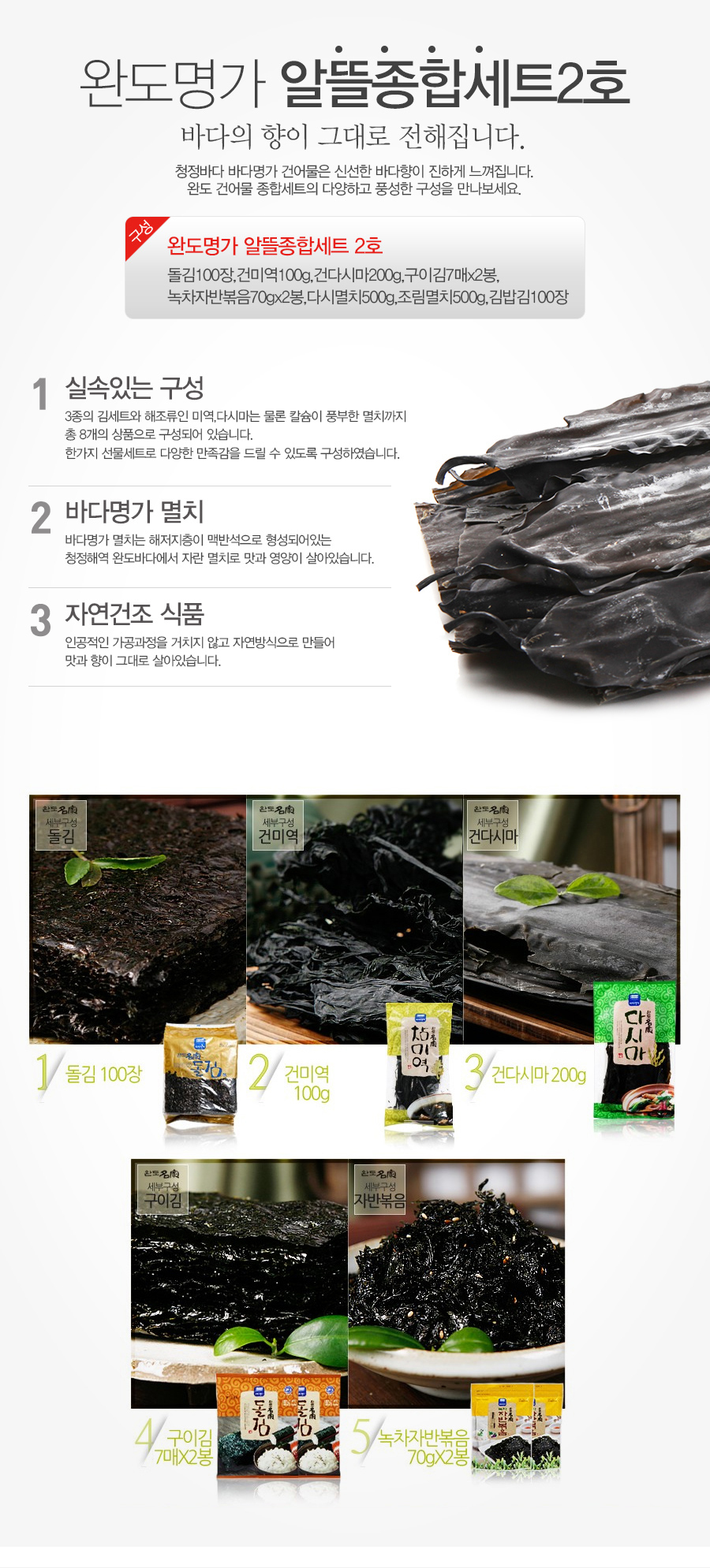 - 상품구성: 돌김100장, 건미역100g, 건다시마200g, 돌김구이김7매x2봉 녹차자반볶음70gx2봉, 대(다시)멸치500g, 중멸치500g, 김밥김100장