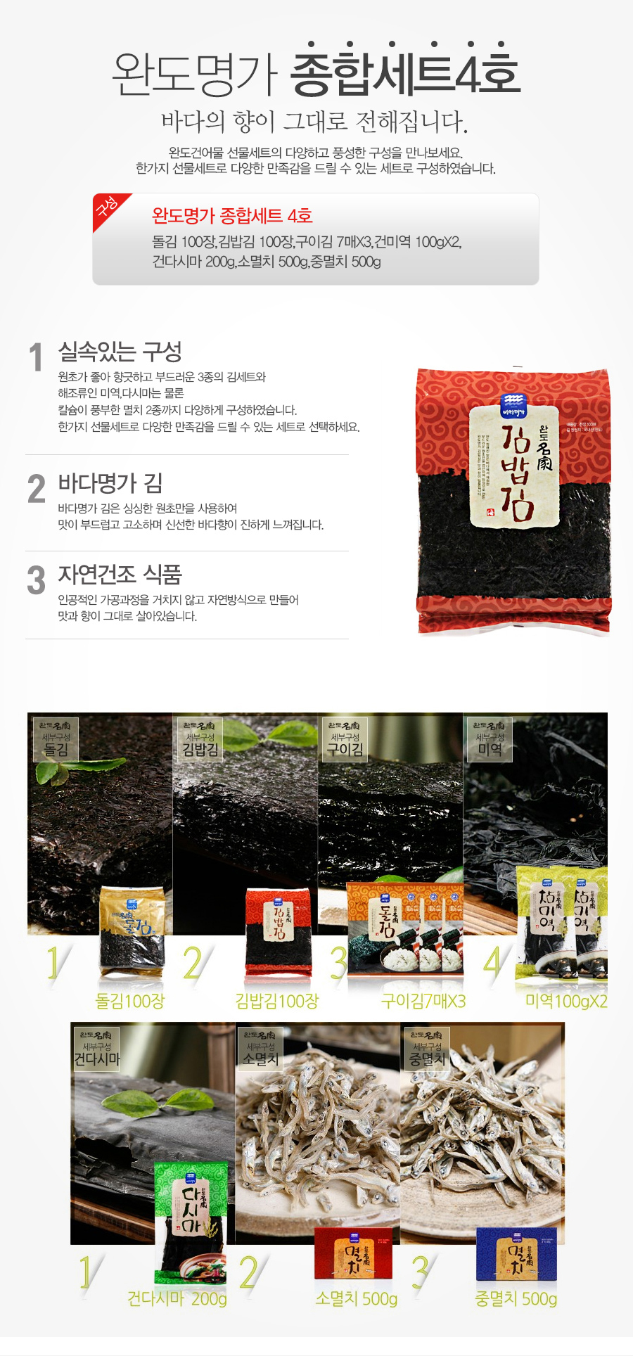 - 상품구성: 돌김100장,김밥김100장,돌김구이김7매x3봉 건미역100gx2봉,건다시마200g, 소멸치500g, 중멸치500g