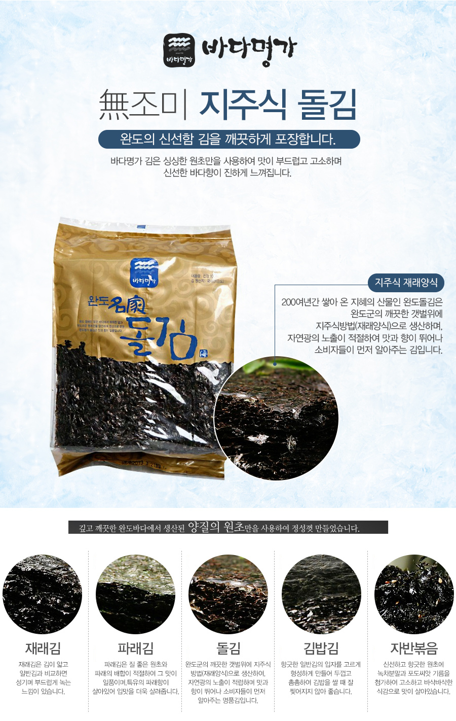 - 포장단위별 내용물의 용량(중량), 수량, 크기: 돌김100장,김밥김100장,돌김구이김7매x3봉 건미역100gx2봉,건다시마200g, 소멸치500g, 중멸치500g