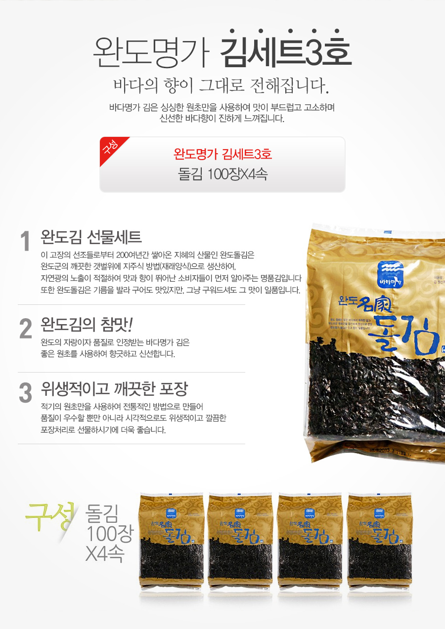 - 품목 또는 명칭: 김세트 3호 / 내용(구성)량 : 상세설명표기