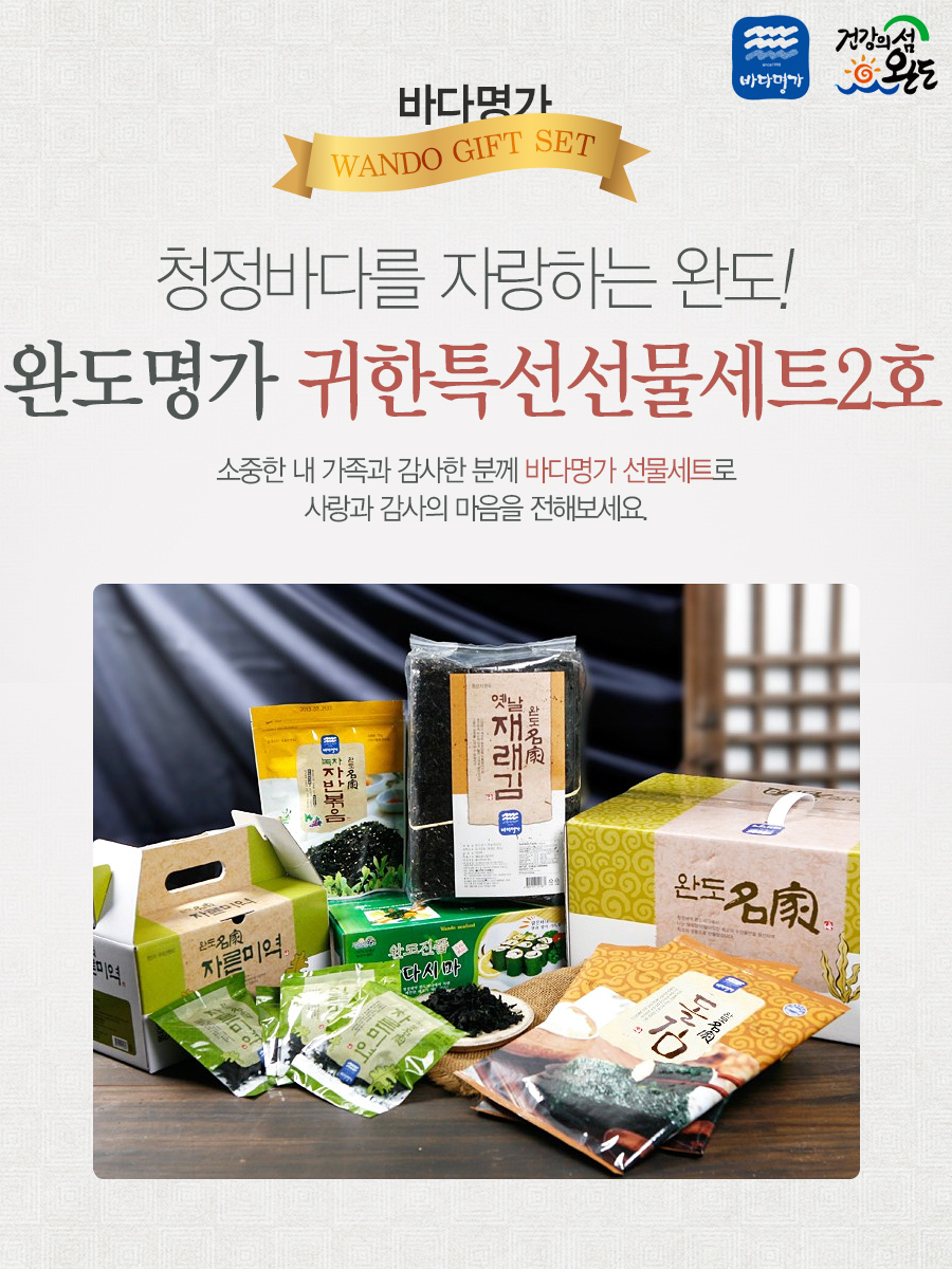 - 포장단위별 내용물의 용량(중량), 수량, 크기: 재래김100장, 돌김구이김7매x2봉, 녹차자반볶음 70g 쌈다시마2kg, 자른미역20gx10봉