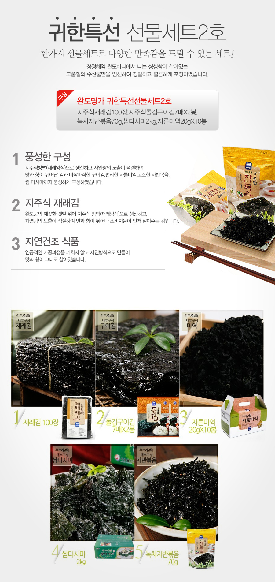 - 상품구성: 재래김100장, 돌김구이김7매x2봉, 녹차자반볶음 70g 쌈다시마2kg, 자른미역20gx10봉