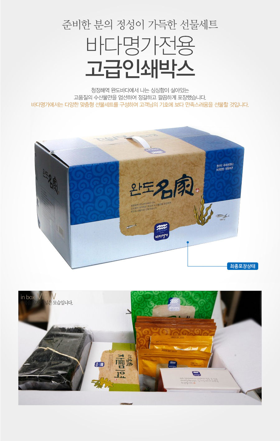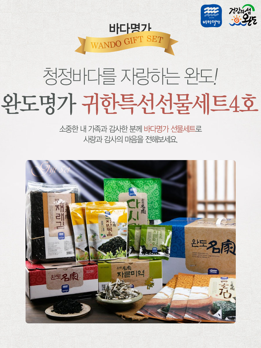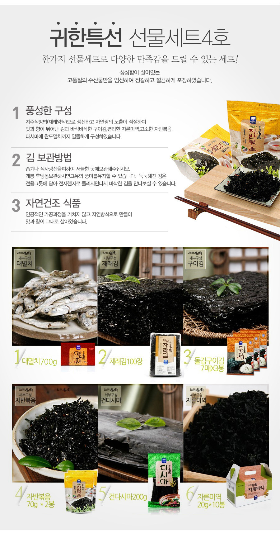 - 상품구성: 대(다시)멸치700g, 재래김100장, 돌김구이김7매x3봉 녹차자반볶음70gx2봉, 건다시마200g, 건미역20gx10봉