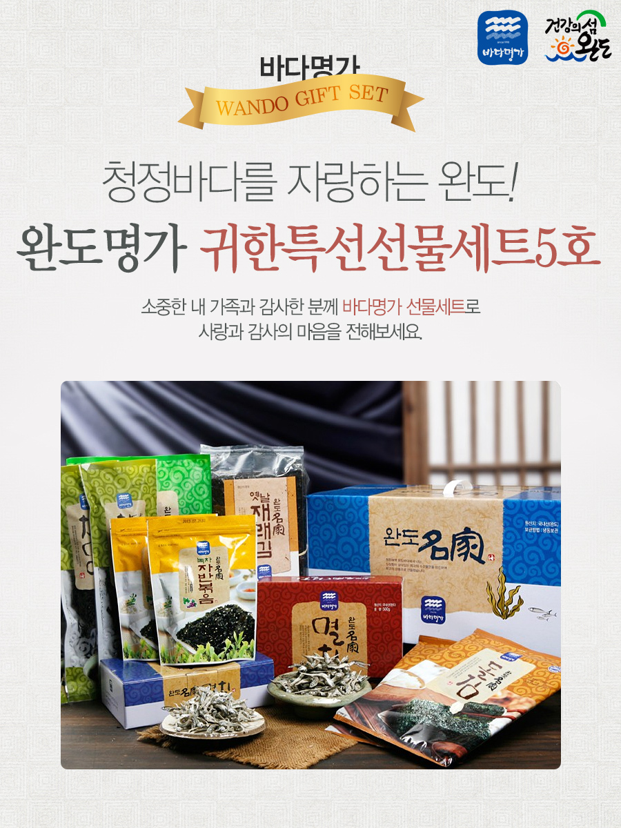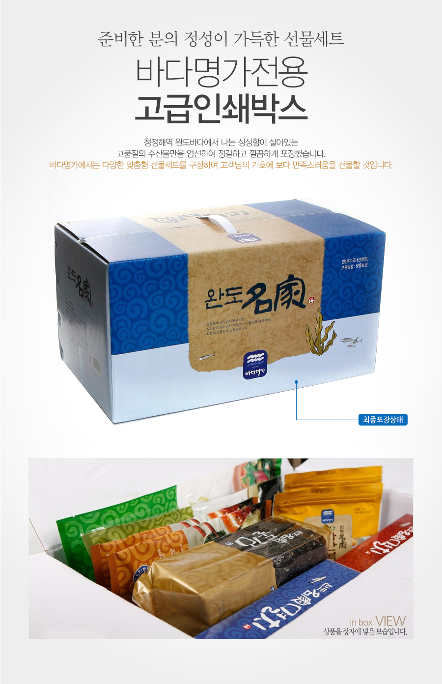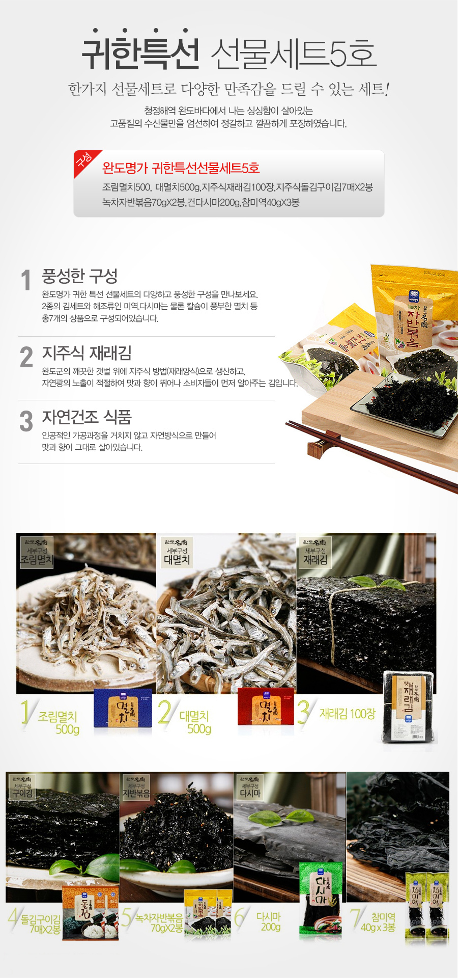 - 상품구성: 중멸치500g, 대(다시)멸치500g, 재래김100장, 돌김구이김7매x2봉 녹차자반볶음70gx2봉, 건다시마200g, 건미역40gx3봉