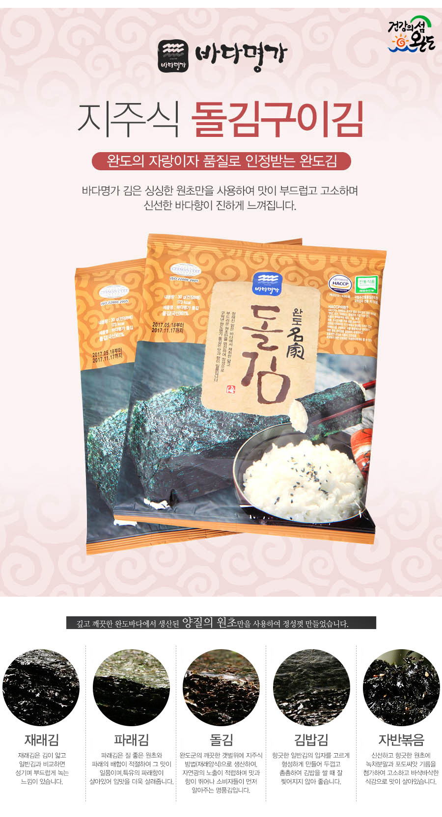 - 원산지: 김(김-국내산), 미역(미역-국내산,소금:호주산),멸치(멸치-국내산,소금-국내산), 다시마(다시마-국내산,소금-국내산), 돌김구이김[가공(조미)김]:김(곱창김(국산))68%,옥수수기름(옥배유) (외국산(헝가리,세르비아,러시아 등)),참기름(외국산(인도,나이지리아,에티오피아 등)), 가공소금[정제소금(국산),L-글루탐산나트륨(향미증진제)], 녹차자반볶음[가공(조미)김:김자반(국내산)62%,옥배유 (옥수수:미국,러시아,브라질등)17%,볶음깨,정백당,대두콩가루,참기름 포도씨유,가공소금[정제소금(국산),L-글루탐산나트륨(향미증진제)],녹차가루(국내산)1.5%