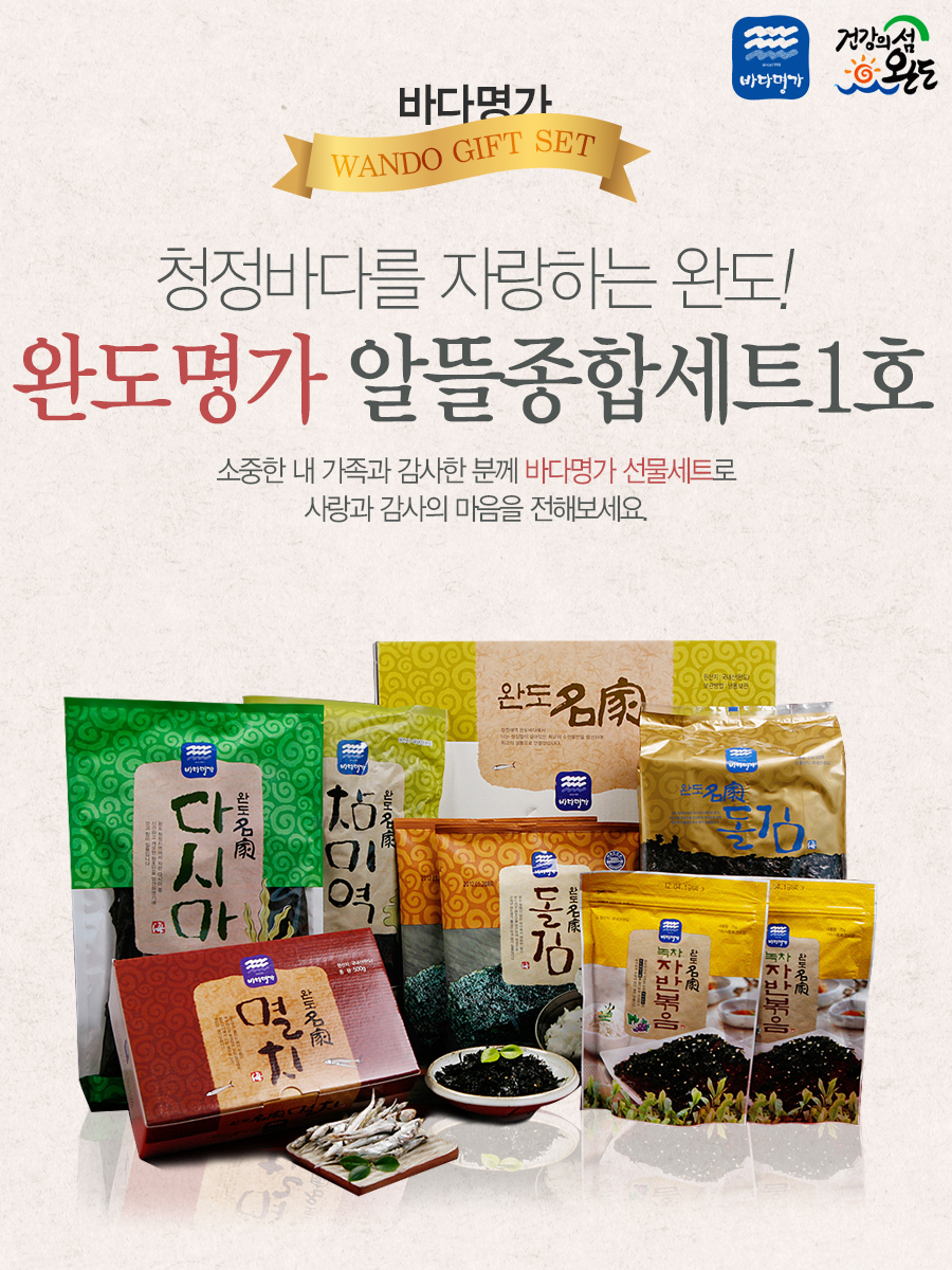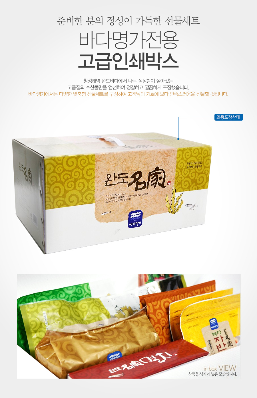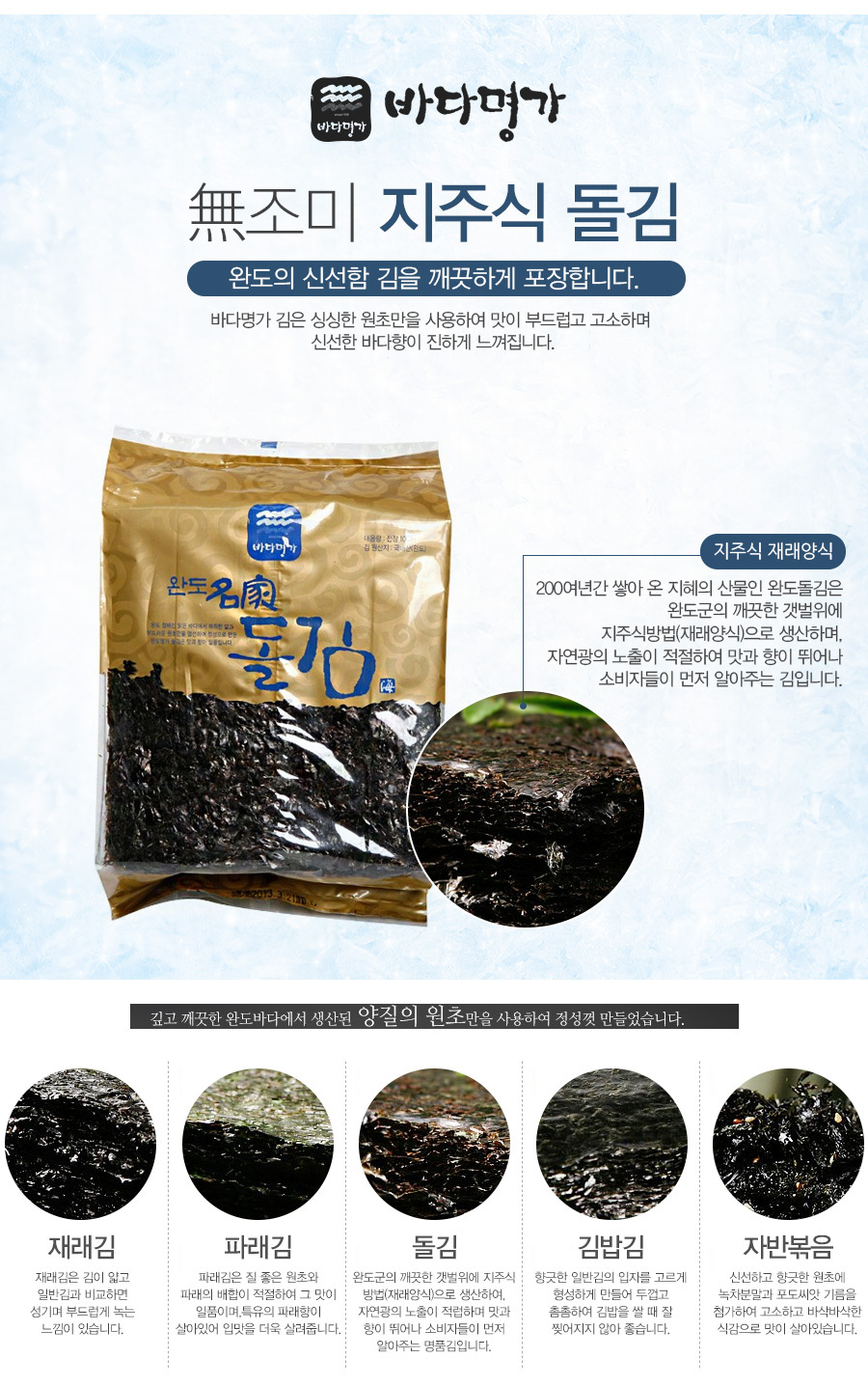 - 포장단위별 내용물의 용량(중량), 수량, 크기: 김(김-국내산), 미역(미역-국내산,소금:호주산), 다시마(다시마-국내산), 멸치(멸치,소금-국내산), 돌김구이김[가공(조미)김]:김(곱창김(국산))68%,옥수수기름(옥배유) (외국산(헝가리,세르비아,러시아 등)),참기름(외국산(인도,나이지리아,에티오피아 등)), 가공소금[정제소금(국산),L-글루탐산나트륨(향미증진제)] , 녹차자반볶음[가공(조미)김:김자반(국내산)62%,옥배유 (옥수수:미국,러시아,브라질등)17%,볶음깨,정백당,대두콩가루,참기름 포도씨유,가공소금[정제소금(국산),L-글루탐산나트륨(향미증진제)],녹차가루(국내산)1.5%