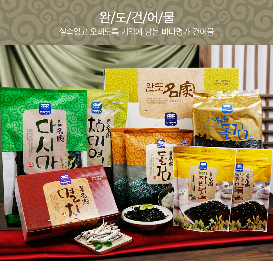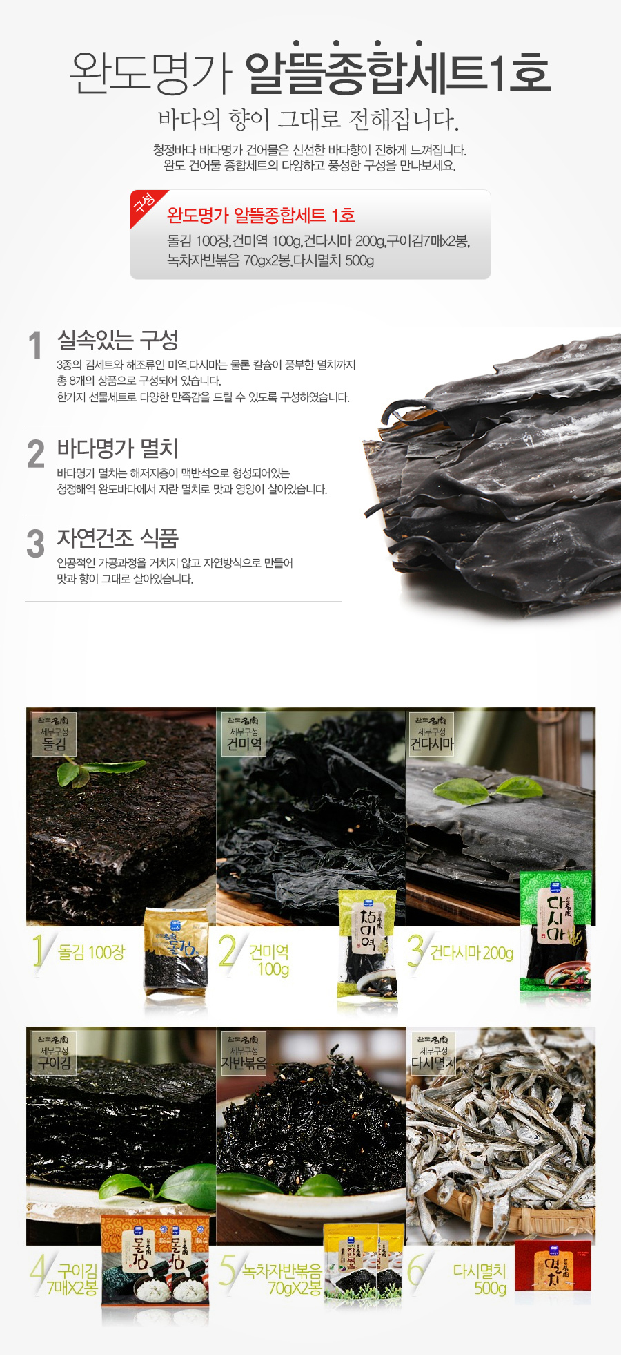 - 상품구성: 돌김100장, 건미역100g, 건다시마200g, 돌김구이김7매x2봉 녹차자반볶음70gx2봉, 대(다시)멸치500g